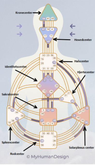 Hvis du nogensinde har slået dit design op og set dit chart, har du sikkert lagt mærke til, at der er en slags kropsbillede med firkanter og trekanter – nogle farvede, andre hvide. Det er dine energicentre, og de fortæller en hel del om, hvordan du bevæger dig gennem livet, hvordan du